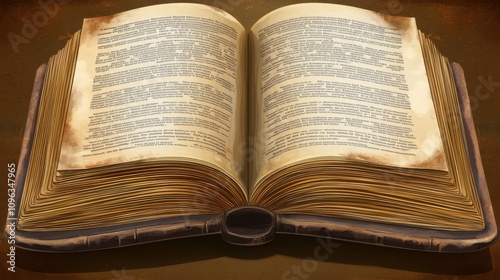 An open vintage book with yellowed pages, showcasing intricate text and an antique aesthetic.