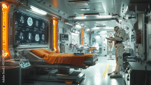 An operating room full of holographic displays showing surgical plans and patient anatomy is depicted in this futuristic scene of surgery involving a robotic arm that uses lasers