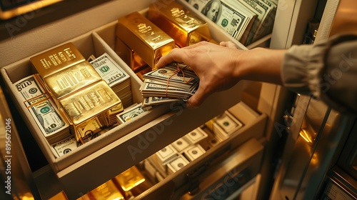 An opulent safe deposit box being opened to reveal bundles of cash, gleaming gold bars, and valuable documents, illustrating financial wealth, high security, and asset protection
