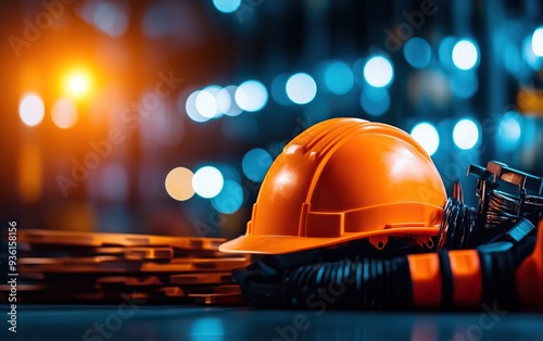 An orange hard hat rests alongside tools in an industrial setting with vibrant bokeh lights in the background, symbolizing safety.