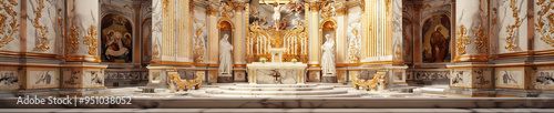 An ornate gilded altar, surrounded by intricate marble carvings, stands as a testament to the enduring artistry of Catholic craftsmanship.