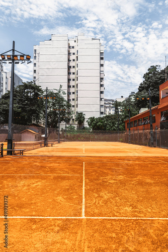 An outdoor view of a sports club with four tennis courts with clay surfaces, safety nets, and spotlight poles. An empty tennis club with residential buildings, trees, and blue sky in the background