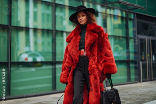 An outdoors fashion portrait of a lovely, confident young woman wearing an orange faux fur coat, hat, green sweater, holding a stylish snakeskin textured handbag, posing in front of a city street.