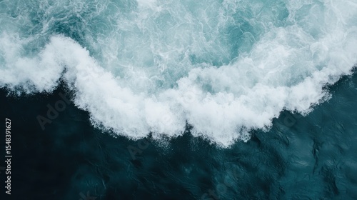 An overhead shot capturing the dynamic movement of waves crashing against the deep blue ocean, presenting a mesmerizing pattern and the rhythm of nature's power and beauty.