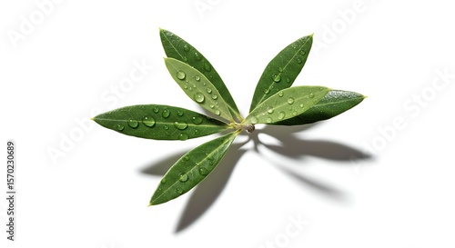 An overhead shot of a single olive branch with dewdrops, casting a shadow.