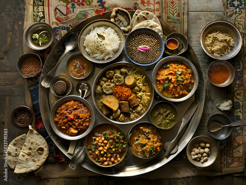 An overhead view of a traditional Indian thali on a metal plate