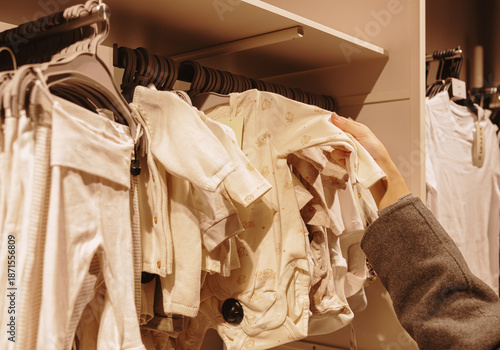 An unrecognizable girl chooses clothes for a newborn baby in the baby department.