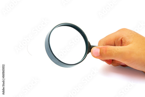 An unrecognizable hand examines a strand of hair with a magnifying glass on a white isolated background