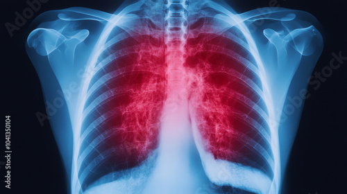 An X-ray image showcasing the detailed structure of human lungs, highlighting areas of interest with intense coloration against a dark backdrop.