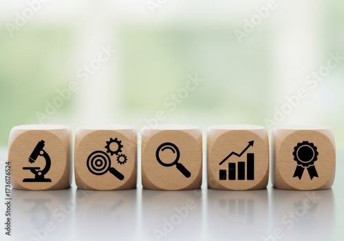 Analytical tools and data analysis icons displayed on wooden cubes in a row on a reflective surface.