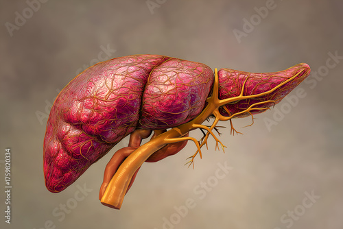 Anatomical Illustration of Human Liver with Vascular and Biliary Anatomy