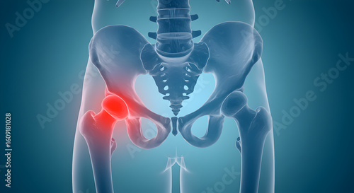 Anatomical Pelvis Illustration with Hip Joint Inflammation in Red Against Teal Gradient Backdrop