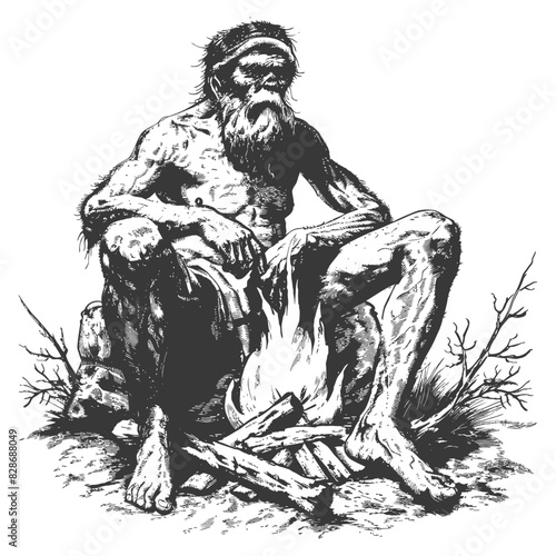 ancient caveman in front bonfire with engraving style
