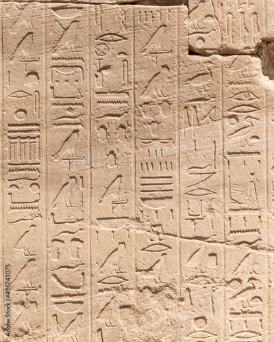 Ancient Egyptian hieroglyphs on the stone walls of the Karnak Temple in Luxor, Egypt