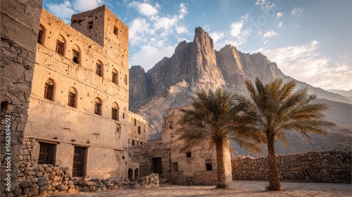 Ancient fortress and palm trees bask in golden light under a mountain range in a desert setting