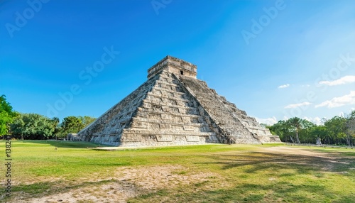 Ancient Mayan pyramid in Chichen Itza, Mexico, surrounded by lush greenery and clear skies