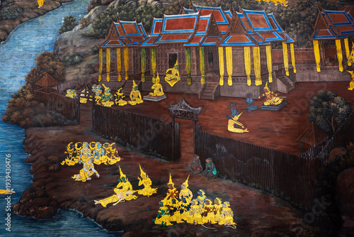 Ancient mural painting with scene from the Ramakien at Wat Phra Kaew or Emerald Buddha Temple in Bangkok, Thailand