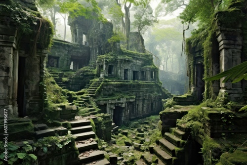 Ancient ruins embrace nature's reawakening. Generative AI