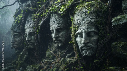 Ancient Stone Faces Surrounded by Lush Greenery in Mysterious Forest