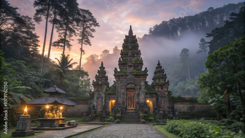 Ancient Temple in Lush Forest, Towering Spires, Carvings, Peaceful Sacredness.