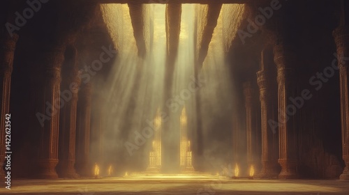 Ancient temple interior, golden light rays