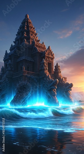 Ancient Temple on a Mystical Island with Glowing Blue Waves at Sunset.