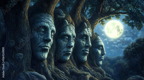 Ancient trees, carved faces, moonlight, mystical forest whispers secrets. Mystical. Illustration