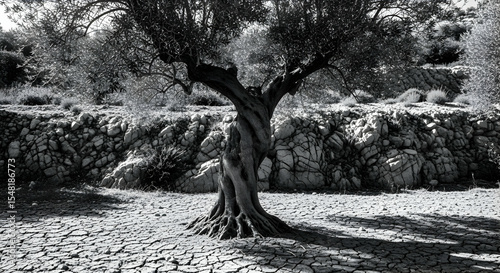 Ancient Twisted Olive Tree Standing Firm on Arid Land in Monochrome Style