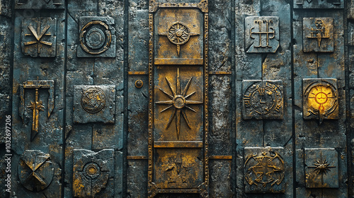 Ancient wall with many symbols and signs, fantasy game concept art, medieval runes, ancient zodiac signs, ancient patterns, fantasy style, metal plates, fantasy background, metal textures.