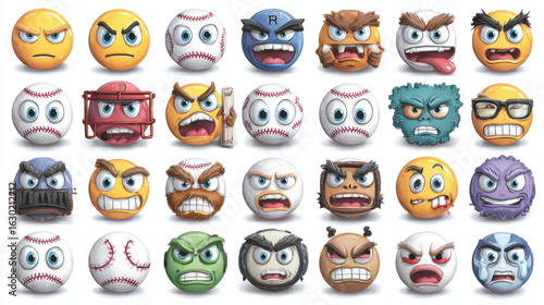 Angry Baseball Emoticons: Expressive Cartoon Faces Set