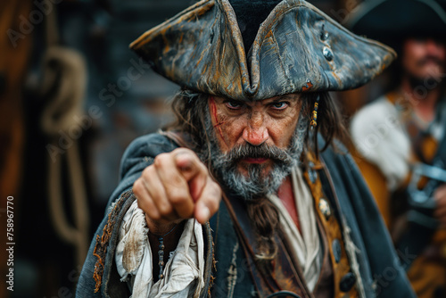 angry bearded pirate captain points finger on ship at sea