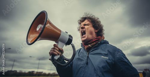 Angry Curly-Haired Man in Blue Jacket Screaming into Orange Megaphone, Overcast Sky. Strong Emotional Expression. Man Doing Announcement On Megaphone. Protester, Protesting.