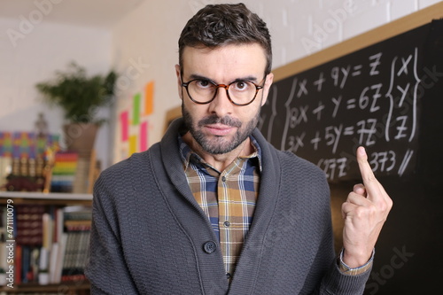 Angry disrespectful teacher showing middle finger in class