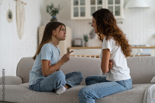 Angry emotional teen girl adolescent daughter fighting with mother parent at home while sitting in front of each other on sofa, selective focus. Problems between teenagers and parents