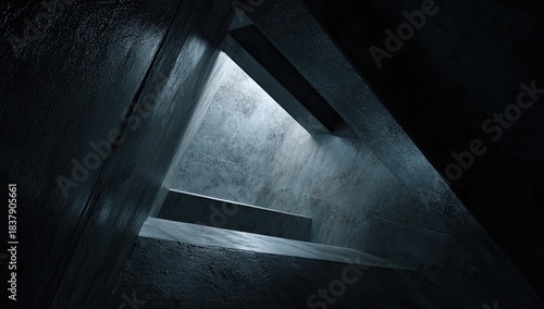 Angular concrete structure with light streaming through a triangular opening, creating shadows