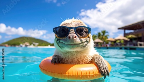 Animated creature with sunglasses enjoys a sunny float in turquoise water