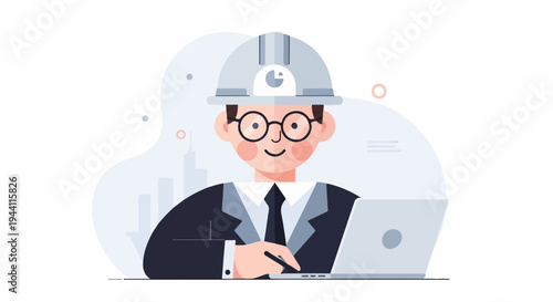 Animated engineer with hard hat and glasses works on laptop