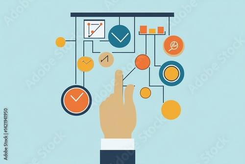 Animated project team using flowcharts define process improvements and eliminate bottlenecks in flat design