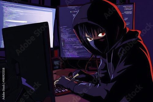 Anime Hacker Girl Working Late at Night with glowing red eyes.