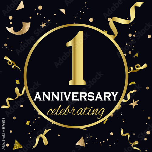 Anniversary celebration decoration. Golden number 1 with confetti, glitters and streamer ribbons on black background.