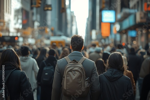 Anonymous African American commuter, Times Square cityscape, back view.