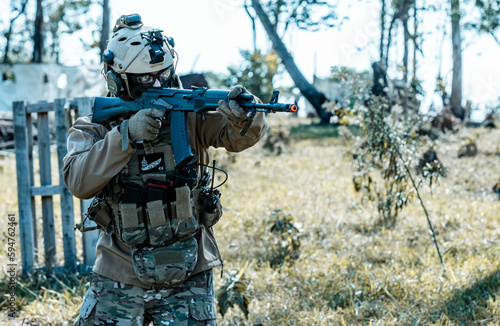 Anonymous soldier with AK-47 in the middle of the battlefield