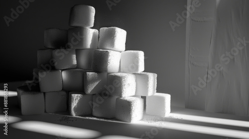 Another black-and-white photo capturing a larger pyramid of sugar cubes, dim light casting gentle shadows enhancing the geometric forms.