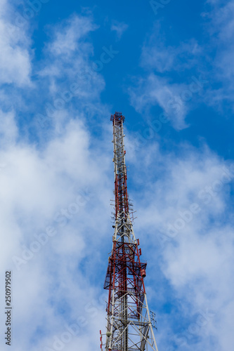 Antenna tower with blue sky and cloud background.
