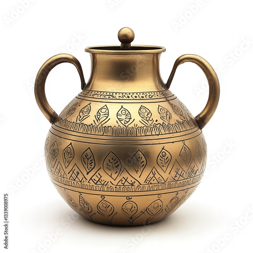 Antique Brass Pot with Lid Engraved with Elegant Leaf and Feather Designs