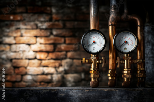 Antique brass pressure gauge and brass water pipe on an old brick wall background..