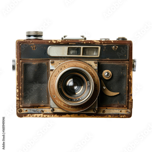 Antique camera, weathered and aged. Front view, close-up. Dark brown, and beige/silver tones. Metal lens, intricate controls