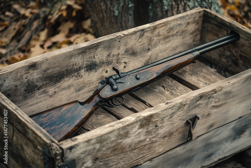 Antique Engraved Rifle In Wooden Crate With Autumn Leaves