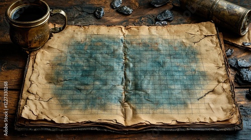 Antique Gridded Journal With Coffee And Artifacts