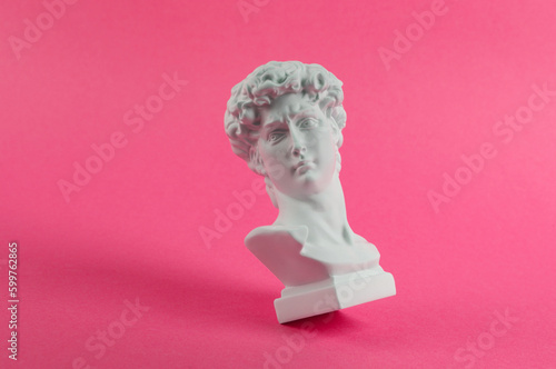 Antique Plaster David bust on pink background. Conceptual pop. Minimal still life photography